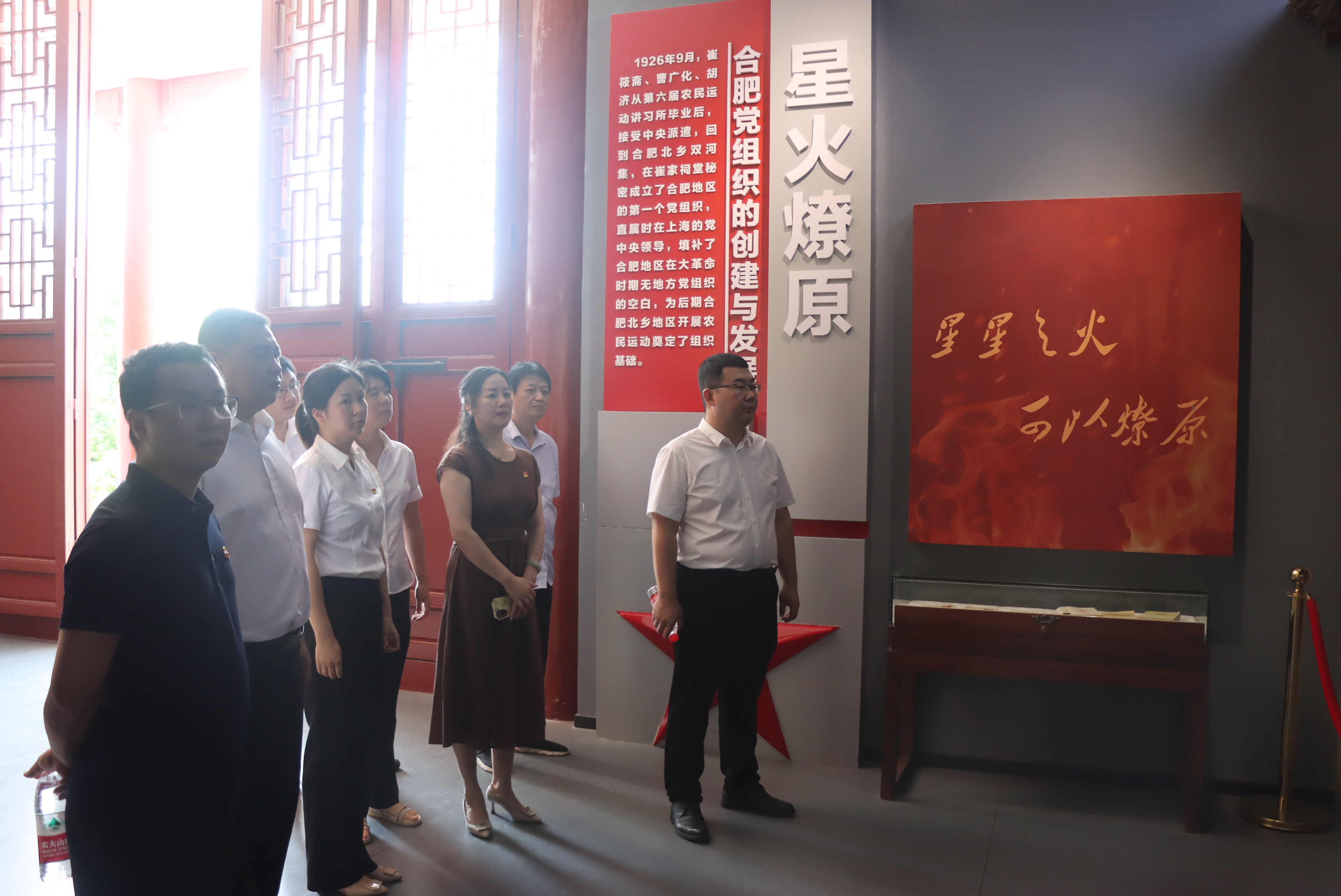 中共合肥北鄉(xiāng)支部紀(jì)念館是合肥市愛國主義教育基地、黨史教育基地、黨風(fēng)廉政建設(shè)教育基地,同時(shí)也是為紀(jì)念合肥地區(qū)第一個(gè)中國共產(chǎn)黨組織(中共合肥北鄉(xiāng)支部)而建。大家跟著講解員認(rèn)真了解了中共合肥北鄉(xiāng)支部創(chuàng)建歷史背景與開展革命光輝歷程,走進(jìn)崔筱齋紀(jì)念館,大家在簡(jiǎn)樸莊重的展廳里認(rèn)真了解了崔筱齋烈士的生平履歷、革命歷程。展廳里珍貴的文物實(shí)物、翔實(shí)的檔案資料,吸引大家駐足良久并詳細(xì)詢問有關(guān)情況,深入了解了合肥北鄉(xiāng)黨支部艱苦卓絕的奮斗史和光輝歷程。懷著無比崇敬的心情,黨員們面向黨旗重溫入黨誓詞。