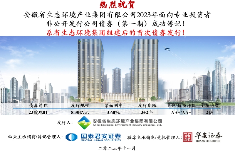 11月24日,省生態(tài)環(huán)境集團(tuán)首單非公開(kāi)公司債券(債券簡(jiǎn)稱:23皖環(huán)01,債券代碼:253104.SH)在上海證券交易所成功簿記發(fā)行,本次債券由國(guó)泰君安、華安證券主承銷,募集金額8.3億元,期限3+2年,票面利率3.60%,圓滿完成集團(tuán)掛牌以后在資本市場(chǎng)的首次亮相。