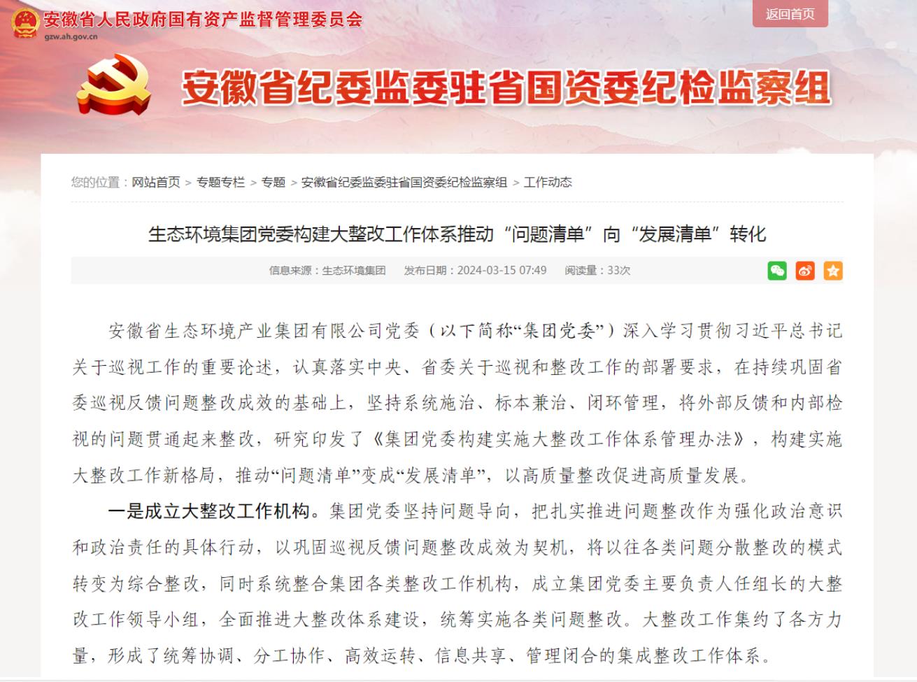 近日,安徽省國(guó)資委網(wǎng)站-安徽省紀(jì)委監(jiān)委駐省國(guó)資委紀(jì)檢監(jiān)督組專欄發(fā)布了《省生態(tài)環(huán)境集團(tuán)黨委構(gòu)建大整改工作體系推動(dòng)“問(wèn)題清單”向“發(fā)展清單”轉(zhuǎn)化》,以下為全文。