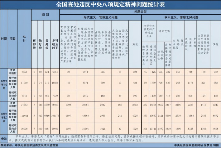 11月27日,中央紀委國家監(jiān)委公布了2022年10月全國查處違反中央八項規(guī)定精神問題匯總情況。今年10月,全國共查處違反中央八項規(guī)定精神問題7558起,批評教育幫助和處理11050人,其中,黨紀政務處分7541人,這是連續(xù)第110個月公布月報數(shù)據(jù)。