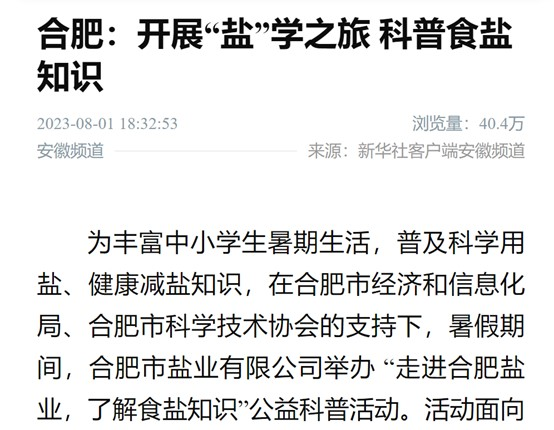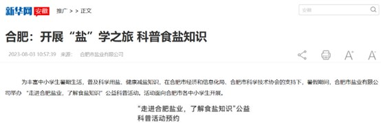2023年7月,合肥鹽業(yè)自1950年成立以來首次對外開放,面向全市中小學(xué)生,開展“鹽”學(xué)之旅,食鹽科普游活動(dòng),活動(dòng)內(nèi)容包括參觀60年歷史的鐵路專用線、省市食鹽儲(chǔ)備倉庫,食鹽健康科普講座,7月份接待來自國內(nèi)外7所中小學(xué)校170名學(xué)生和家長,8月份已預(yù)約8場食鹽科普游。
