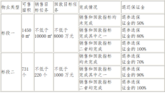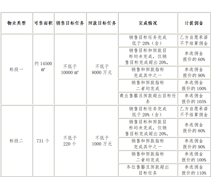 七、投標(biāo)限價:本次比選文件中標(biāo)段一和標(biāo)段二所涉及的業(yè)態(tài)在合作期限、銷售完成目標(biāo)、回款目標(biāo)、分銷團隊人員配備、傭金計提點數(shù)、以及履約保證金等設(shè)定了最低報價指標(biāo),低于此指標(biāo)的按廢標(biāo)處理。