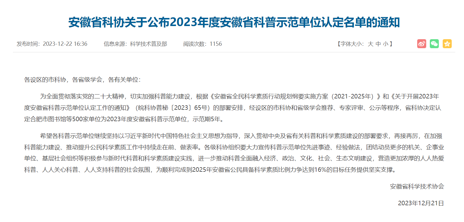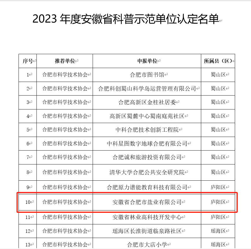 為全面貫徹落實黨的二十大精神,切實加強(qiáng)科普能力建設(shè),根據(jù)《安徽省全民科學(xué)素質(zhì)行動規(guī)劃綱要實施方案(2021-2025年)》和《關(guān)于開展2023年度安徽省科普示范單位認(rèn)定工作的通知》(皖科協(xié)普秘〔2023〕65號)的部署安排,經(jīng)設(shè)區(qū)的市科協(xié)和省級學(xué)會推薦、專家評審、公示等程序,安徽省科協(xié)決定認(rèn)定安徽省合肥市鹽業(yè)有限公司為2023年度安徽省科普示范單位,示范期5年。